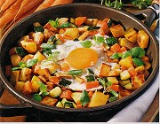 Kartoffeln waschen, sauber bürsten und würfeln. Zucchini waschen, Enden abschneiden. Karotten putzen und waschen, Zucchini und Karotten ebenfalls würfeln. Öl in einer großen Pfanne erhitzen, Kartoffeln und Karotten hinein geben und 10-15 Minuten braten.