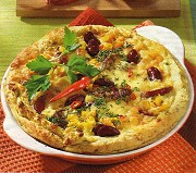 Mais und Kidney Bohnen abtropfen lassen. Cabanossi in Scheiben schneiden. Chilischote putzen, waschen und in feine Ringe schneiden. Topfen mit Eiern verrühren. Mit Salz und Pfeffer würzen.