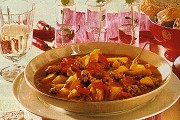 Zwiebeln abziehen und würfeln. Paprikaschoten halbieren, entkernen, waschen und in Stücke schneiden. Tomaten waschen, halbieren, Stielansätze und Kerne entfernen und das Fruchtfleisch in Stücke schneiden. Peperoni putzen, entkernen, waschen und in feine Ringe schneiden. Butter in einem Topf erhitzen, Faschiertes darin von allen Seiten anbraten. Vorbereitetes Gemüse und Peperoni zufügen und kurz mitdünsten. Tomatenmark, Senf und Zucker hinzufügen, Brühe angießen und die Suppe ca.25 Minuten kochen.